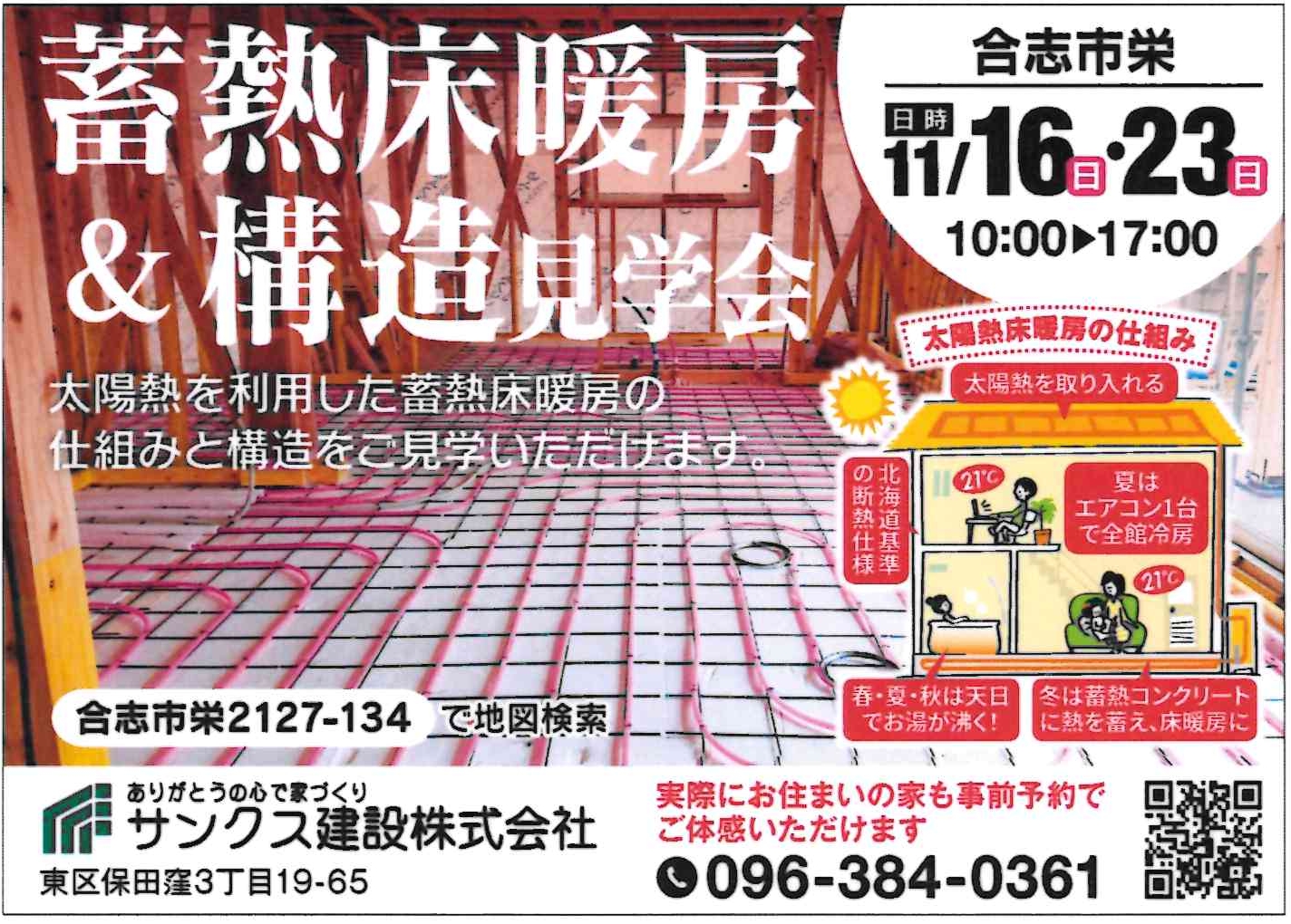 投稿日: 2025年11月13日蓄熱床暖房&構造見学会 合志市栄でハイブリッドソーラーハウスを建築中です。 ハイブリッドソーラーハウスのシステムのうち、核心部分の蓄熱床暖房がちょうど見られる状態です。 蓄熱に利用するコンクリートは、水分を多く含んでいるため、床を貼る前にボイラーで温めて水分を飛ばします。 今なら、蓄熱床暖房のコンクリートが暖まっている状態を、見て触って体感することが出来ます。 いずれ見えなくなってしまう床暖房の仕組みや、地震に強い頑丈な木造の骨組み、耐震金物等、この機会しか見ることが出来ませんので、ぜひお越しくださいませ。