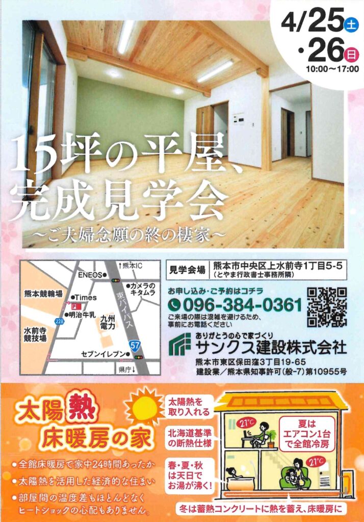 投稿日: 2026年4月21日 投稿者: けんちゃん15坪の平屋。4/25(土)・26(日) 完成見学会 15坪の平屋。4/25(土)・26(日) 完成見学会「終の棲家」だから、もっと自由で、もっと心地よく。 15坪というサイズだからこそ叶う、夫婦ふたりの上質な平屋が完成しました。 見どころは、自然エネルギーである太陽熱を利用して家全体を暖める床暖房。 24時間ずっと快適なのに、光熱費もスマートに。 将来の安心と快適さを両立した住まいを、中央区上水前寺でご見学ください。